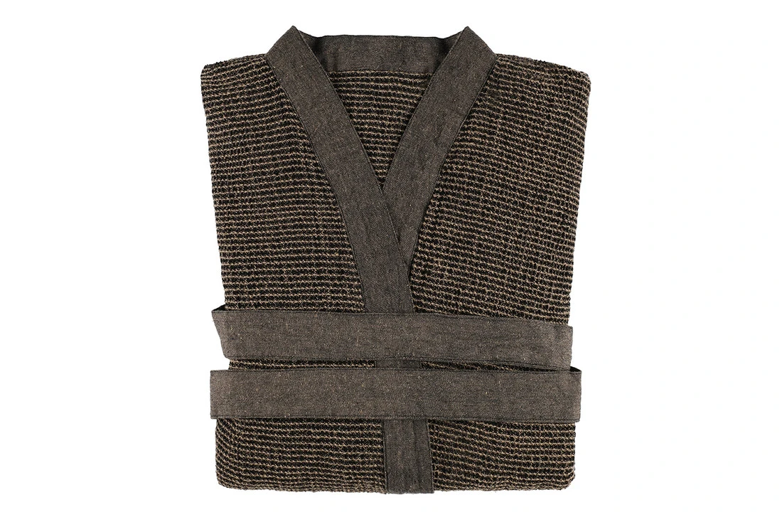 Comfortabele badjas met Chambray boorden en riem. Kenno saunatextiel is gemaakt van gerecycled katoen, waardoor de stof een natuurlijke zachtheid en levendige textuur krijgt.